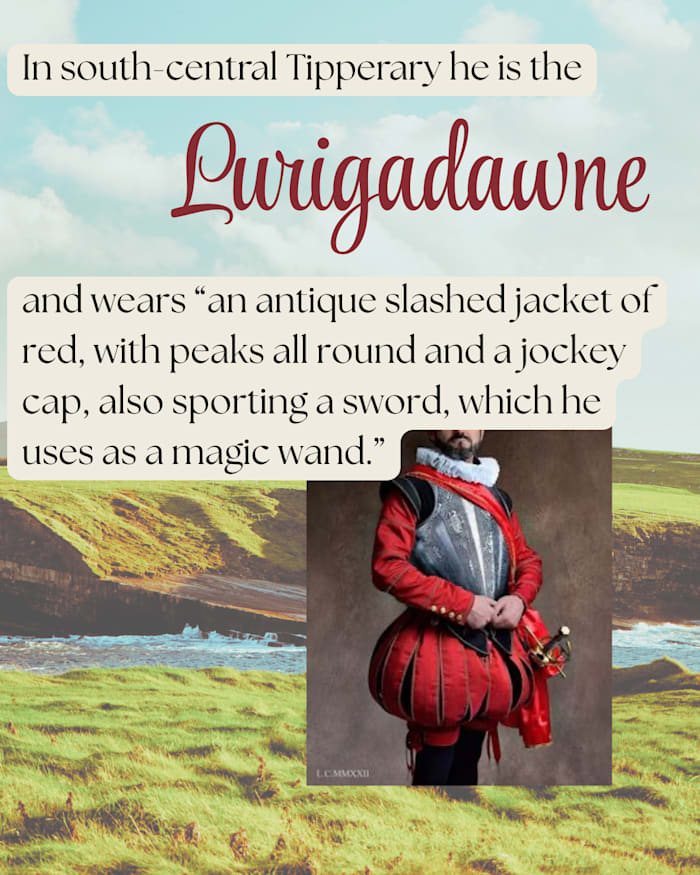 Illustration, final page: A traditional leprechaun in red coat and breeches, one of Ireland’s most notorious tricksters. (Photo: Sybil Shearin / Children Story Tales)